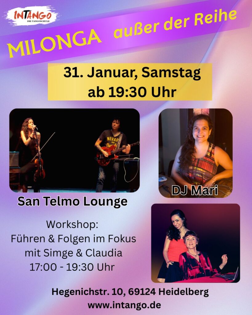 Milongas außer der Reihe – Milonga mal anders! Am 5. Samstag im Monat tanzen wir außerhalb der Reihe und gestalten spezielle Milongas, die neue Impulse setzen und den Tango aus einer anderen Perspektive erlebbar machen.
